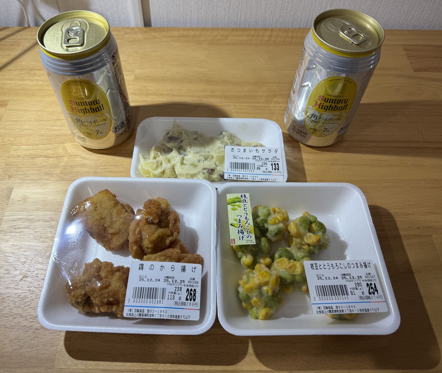 今日はクリスマスイブで、お店が開いていなさそうなので、花輪食品さんでお惣菜とハイボールを購入。