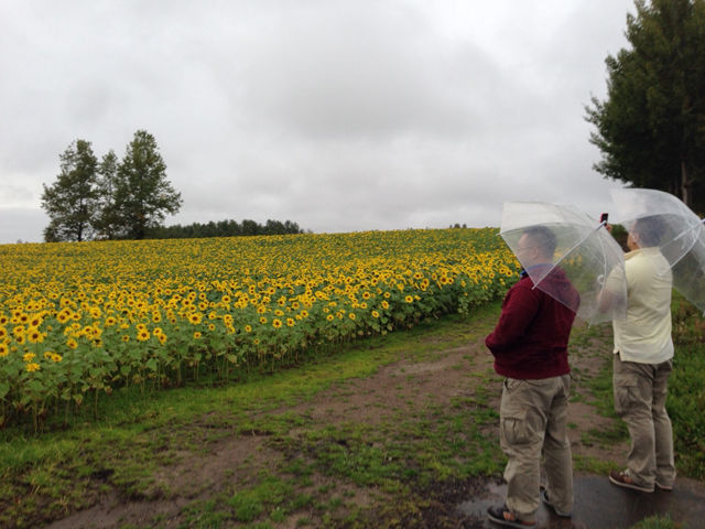 雨の中、翌日以降に備えてヒマワリやキカラシ探しのロケハンを行っていたところ、三本の木のそばにヒマワリ畑を発見。車を止めて写真を撮っていると、一台の車(「わ」ナンバー)が通り過ぎましたが、バックして戻ってきて私と同じ路肩に車を突っ込んできました。