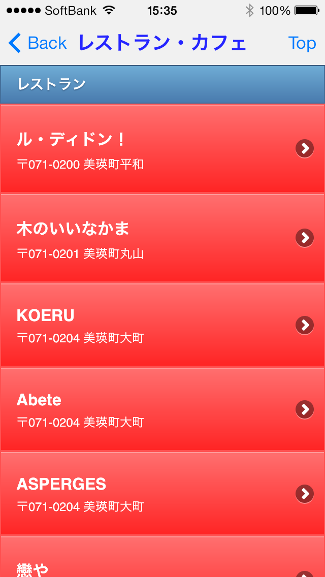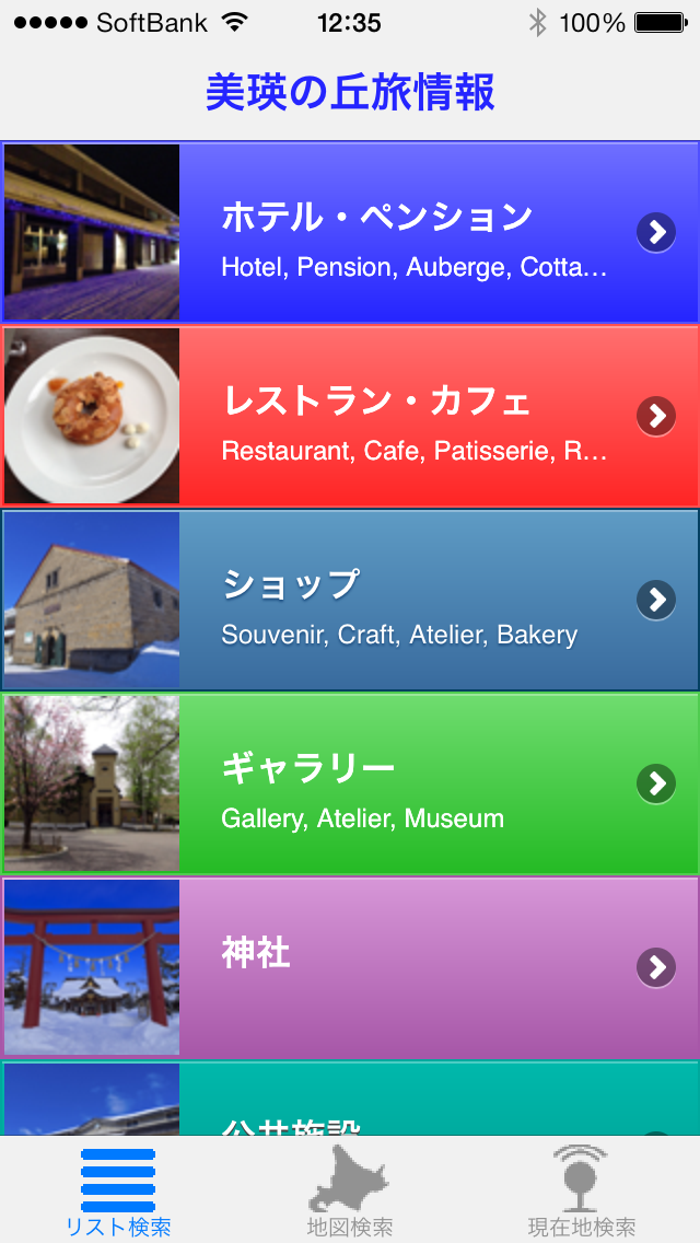 この『美瑛の丘旅情報』は、レストランやカフェなどの飲食施設、ホテルやペンションなどの宿泊施設、農産物直売所やクラフトショップなどのお店、写真ギャラリーやアトリエ、神社、公共施設、観光案内所などの場所を、地図やGPS、マップコードなどを用いて、わかりやすく紹介するアプリです。