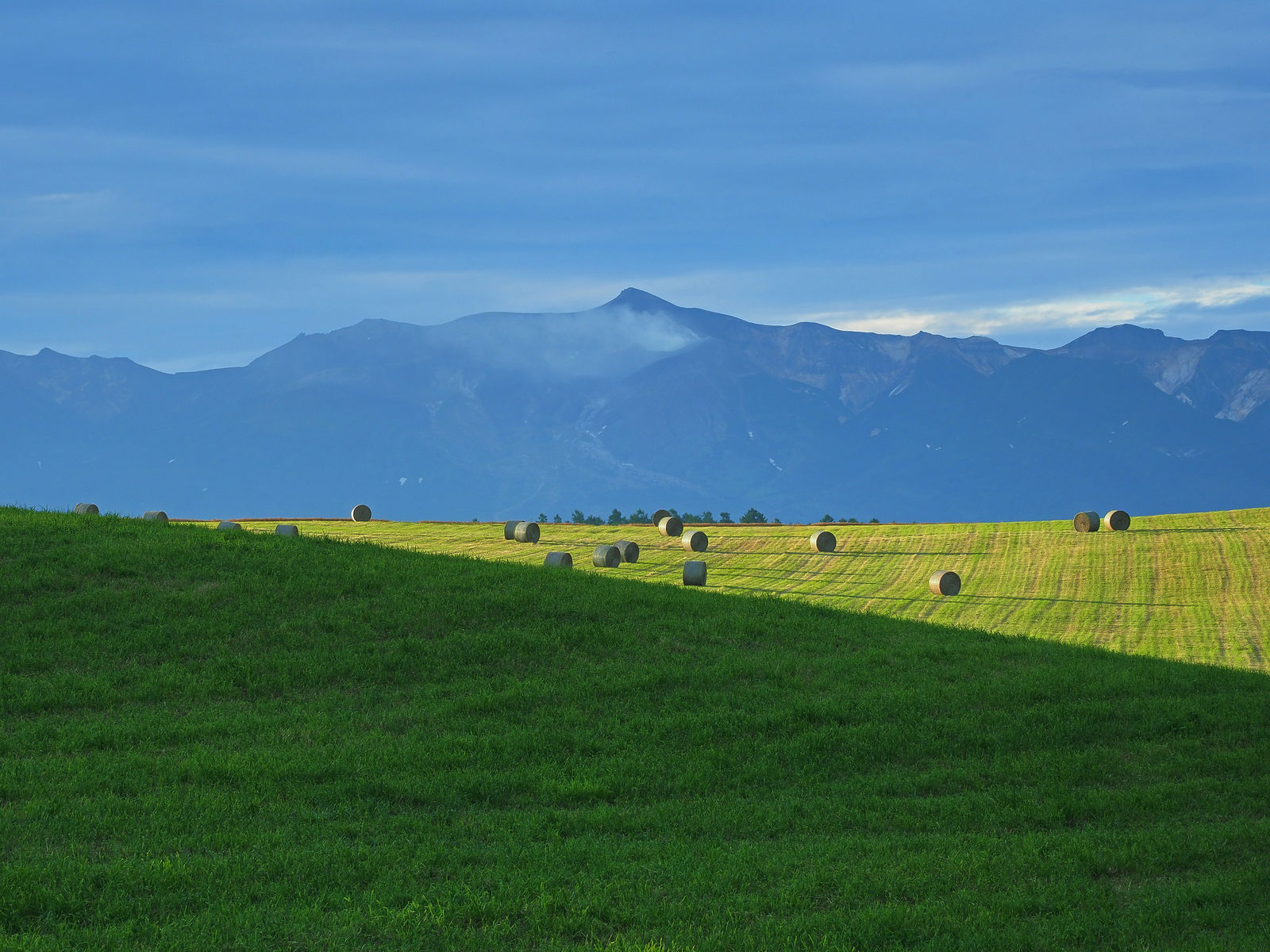 今朝は、十勝岳連峰が綺麗に見えたので、牧草ロールとともに。