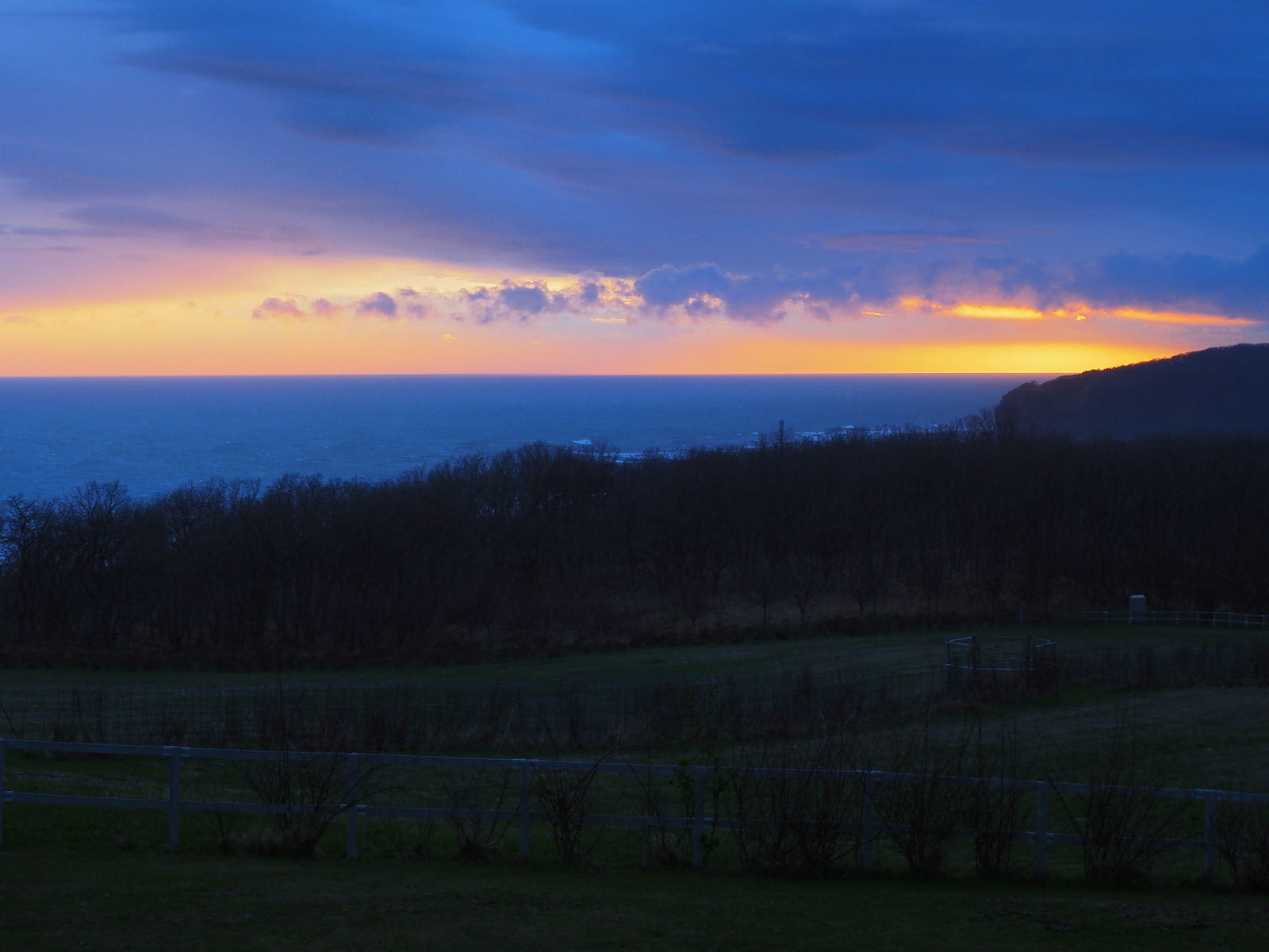 夕食後、部屋に戻り窓から外を見ると、判官岬付近の空が、微かに見える夕陽とともに美しく輝いていました。