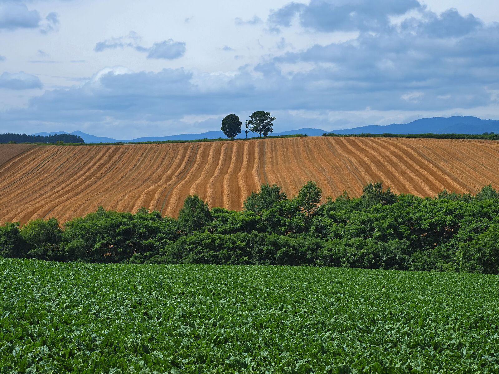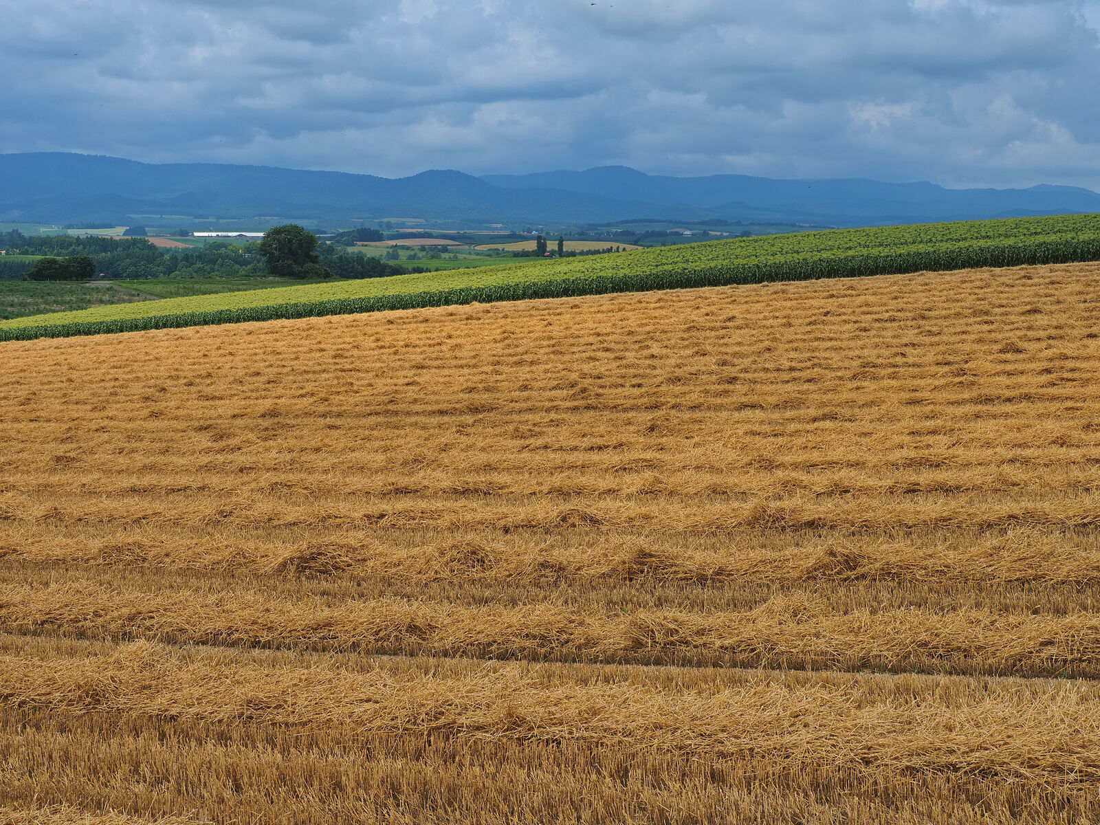 小麦の収穫後、麦稈が整列する丘。
