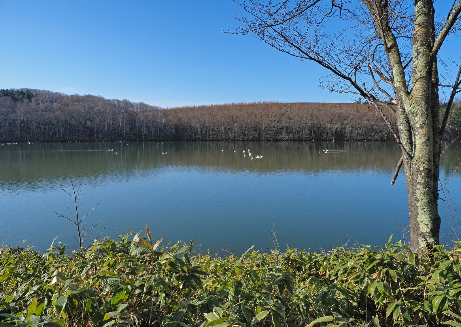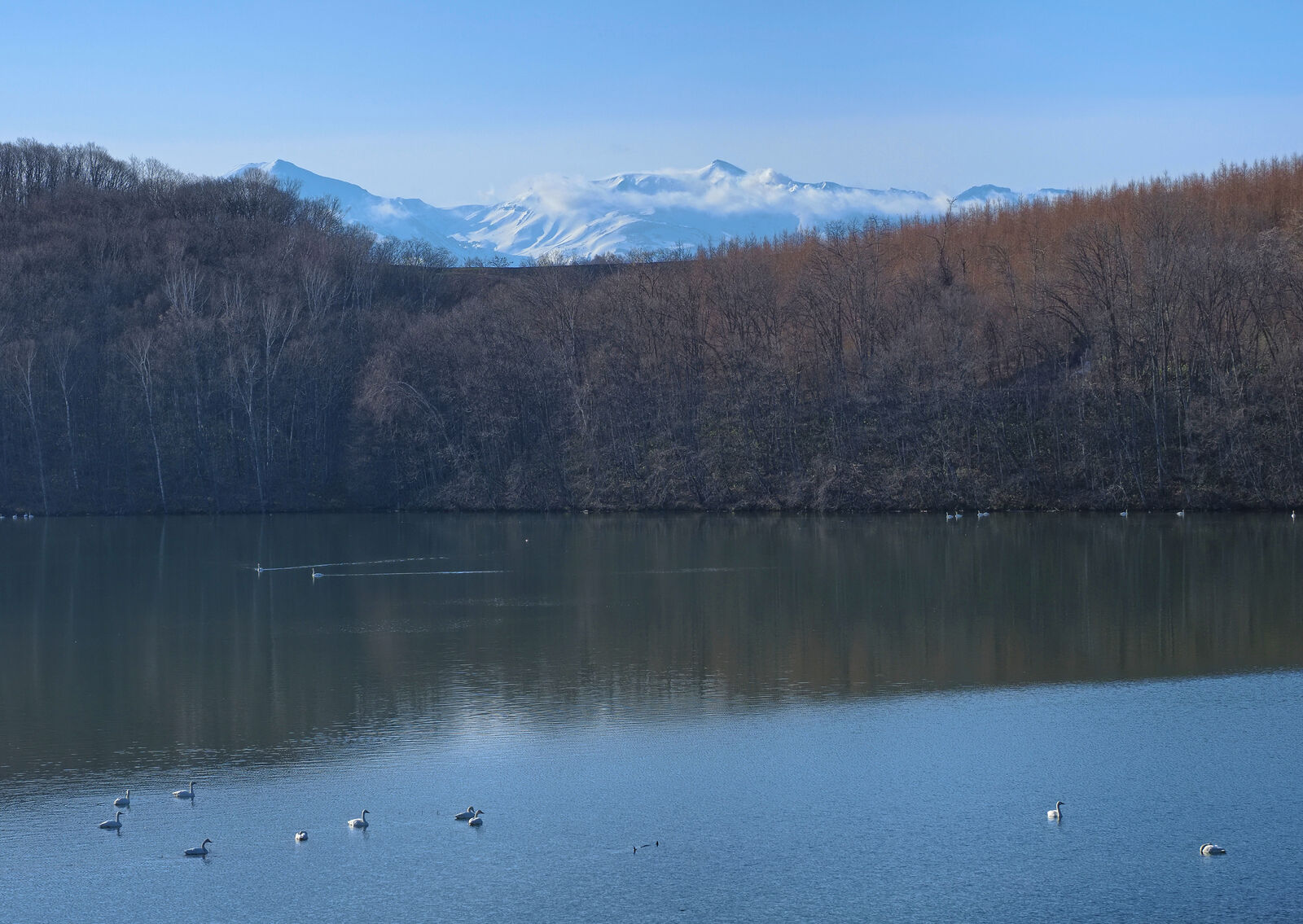 ダム湖では、白鳥たちが優雅なひとときを過ごしていました。