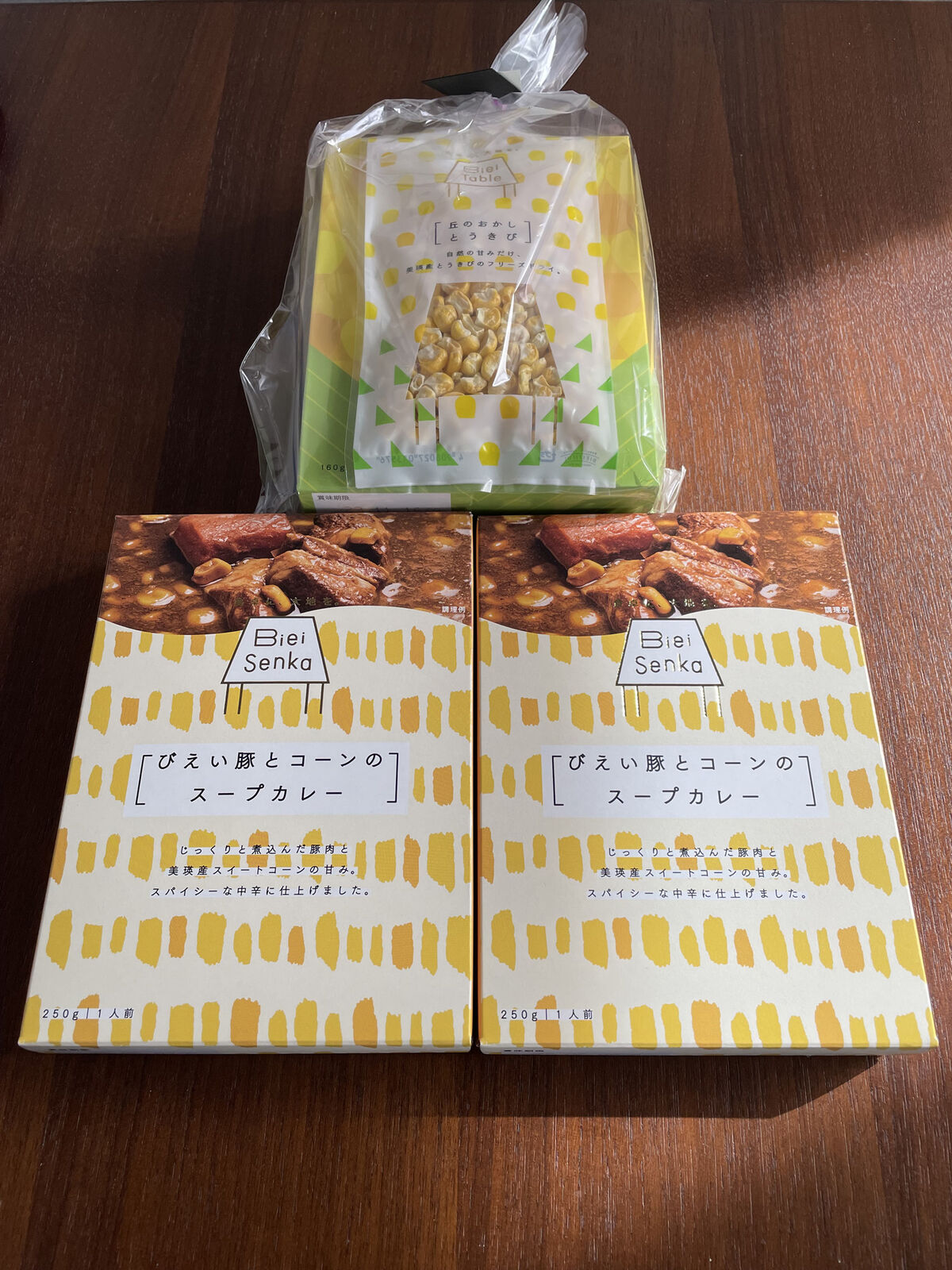 今回のお土産は、美瑛選果さんで「とうきびスープセット」と新発売の「びえい豚とコーンのスープカレー」