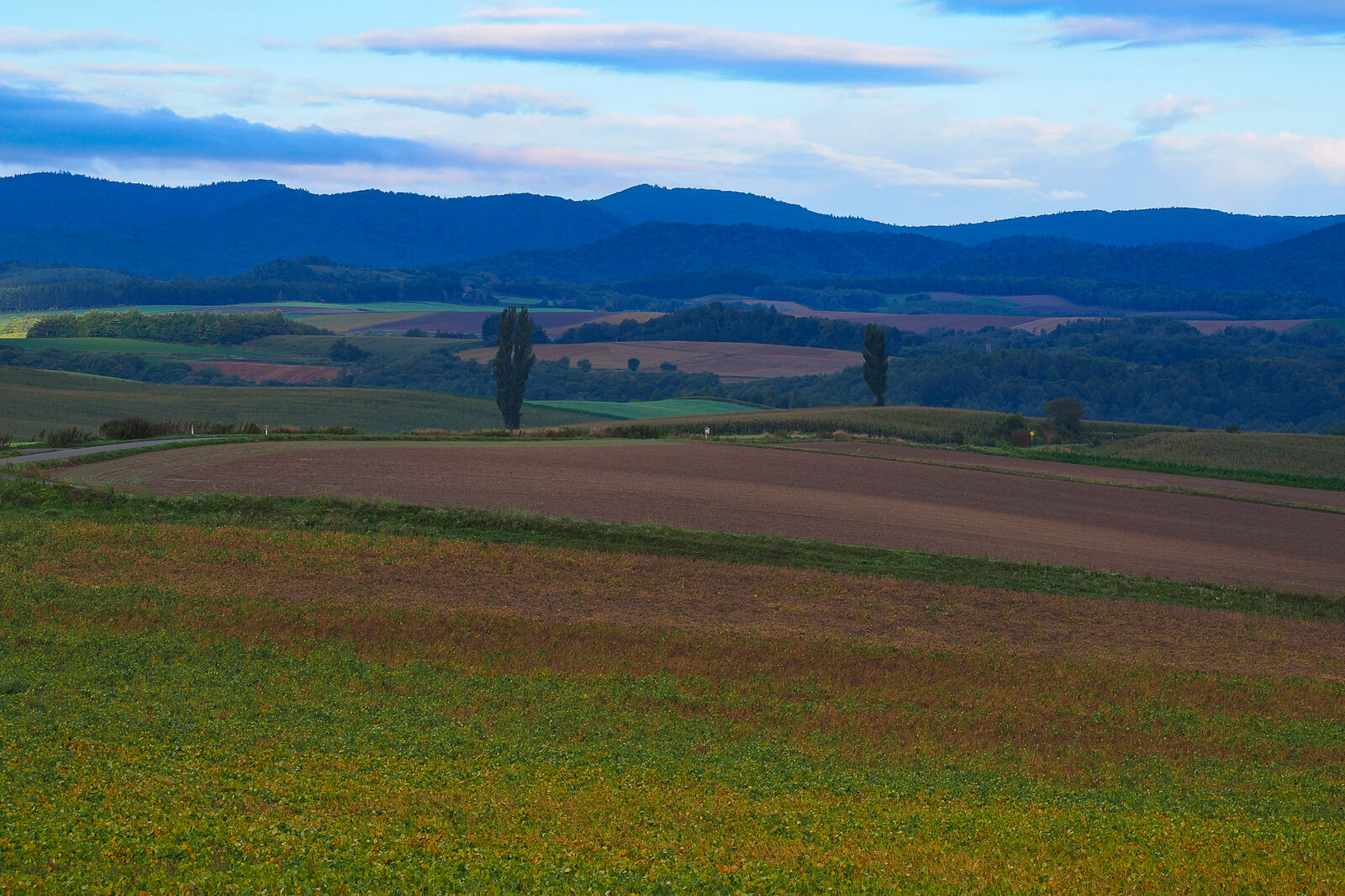 美瑛に戻り、2本のポプラをバックに、少し色づいてきた大豆畑。