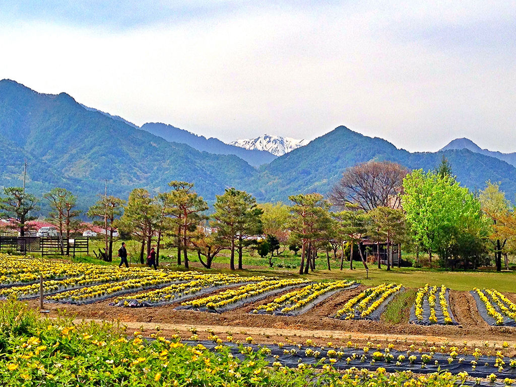 北アルプスを背景に、わさび畑と八重桜