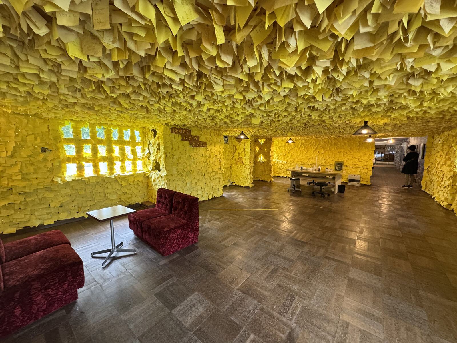 壁や天井一面に、来訪者の方々からのメッセージカードが展示されています。