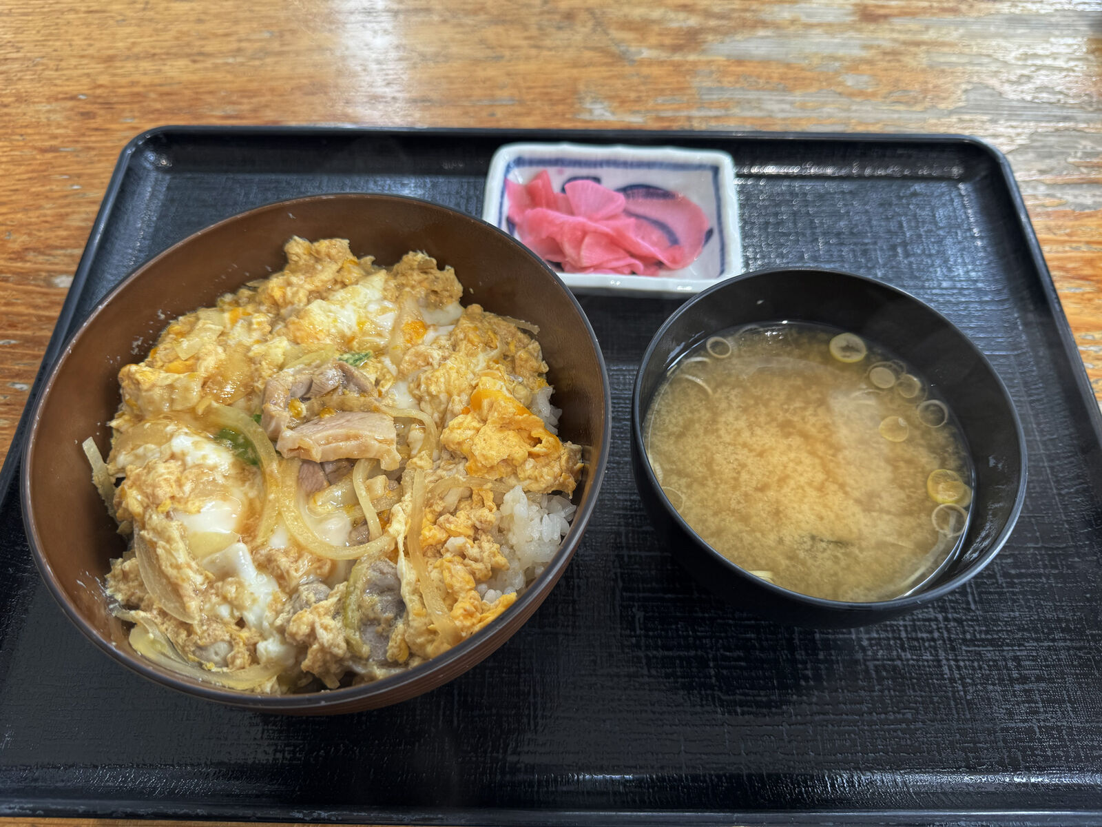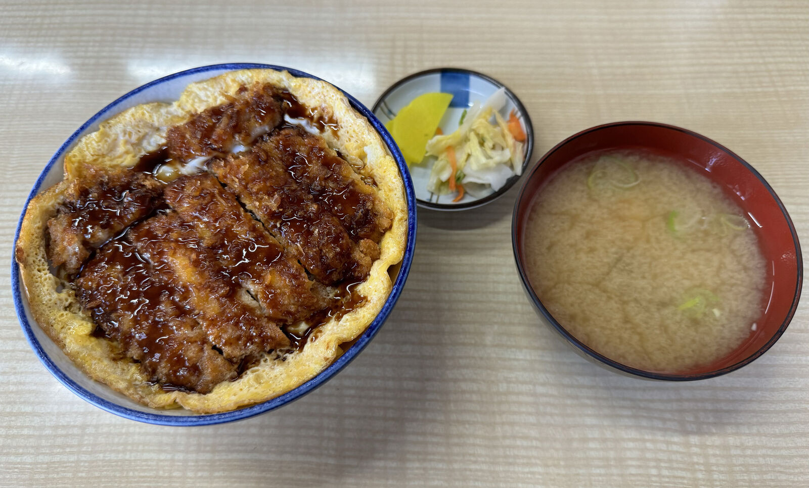 一般的なソースかつ丼と違って、キャベツ千切りと卵焼きの上にカツが乗っています。