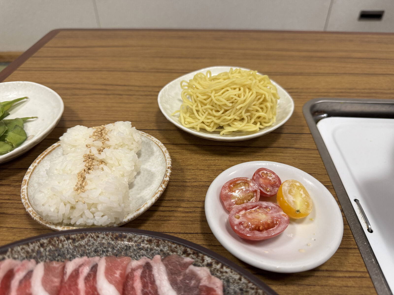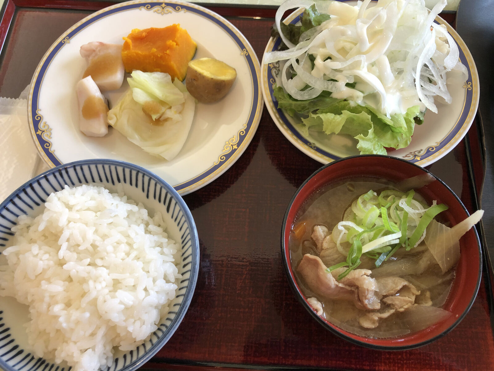 セットには、野菜以外に、ひと口おにぎり、トマト、〆のラーメンが付いてきます。