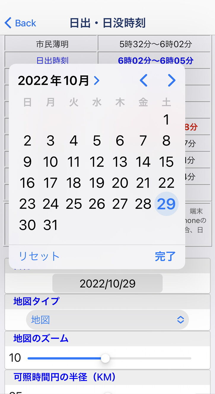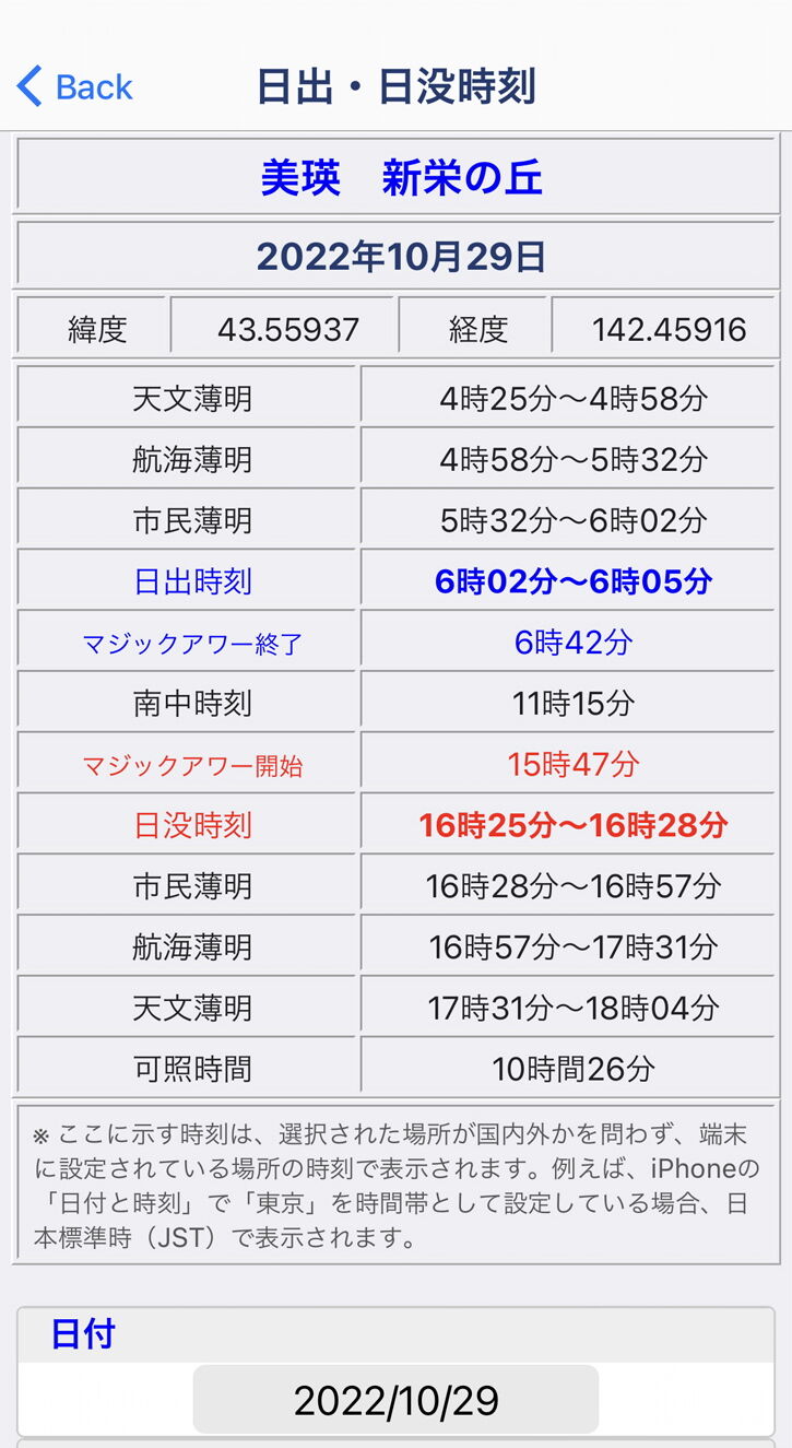 例えば、2022/10/29を選択すると、以下のようにその日の日出・日没などの時刻が表示されます。