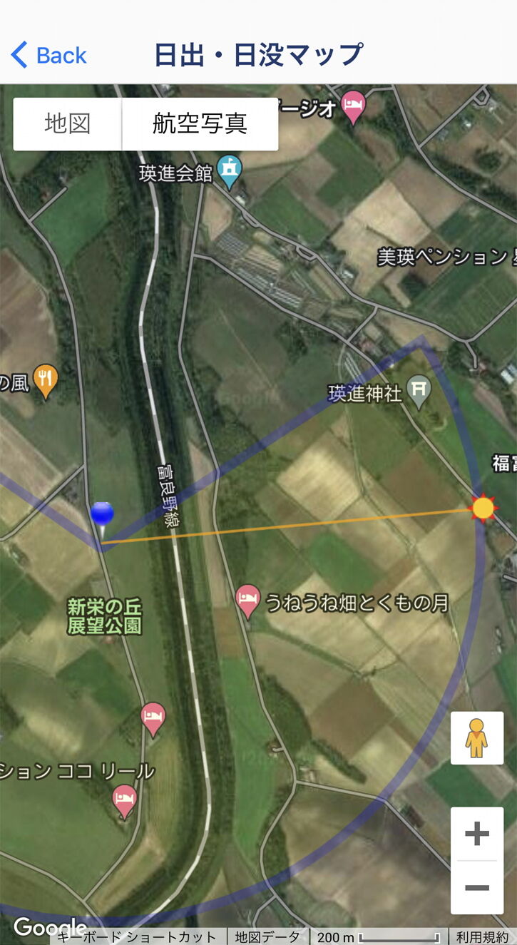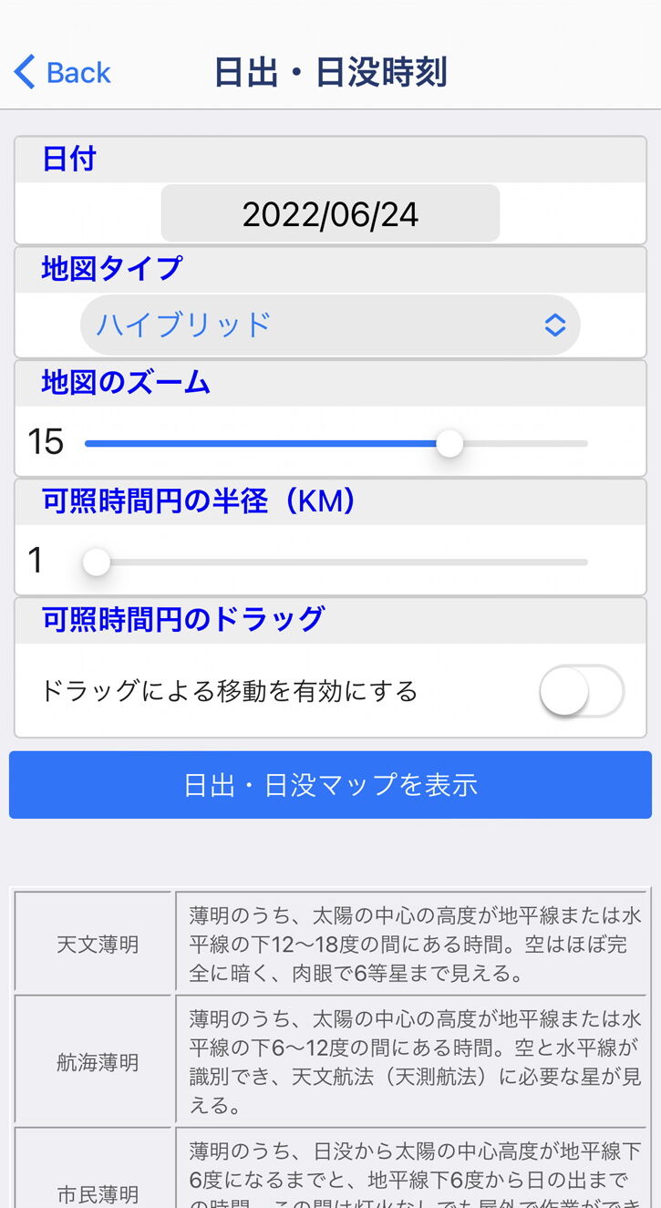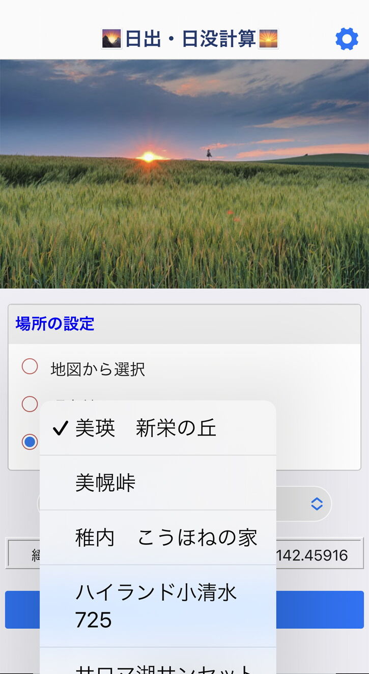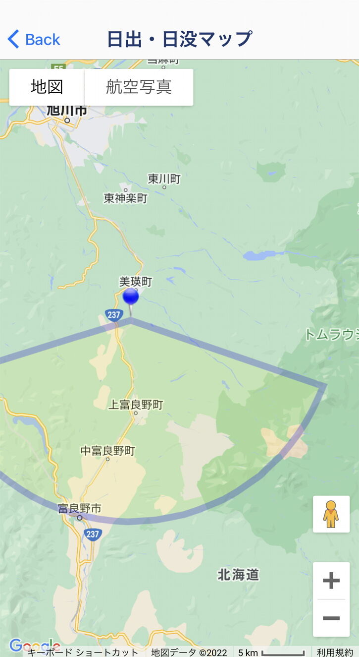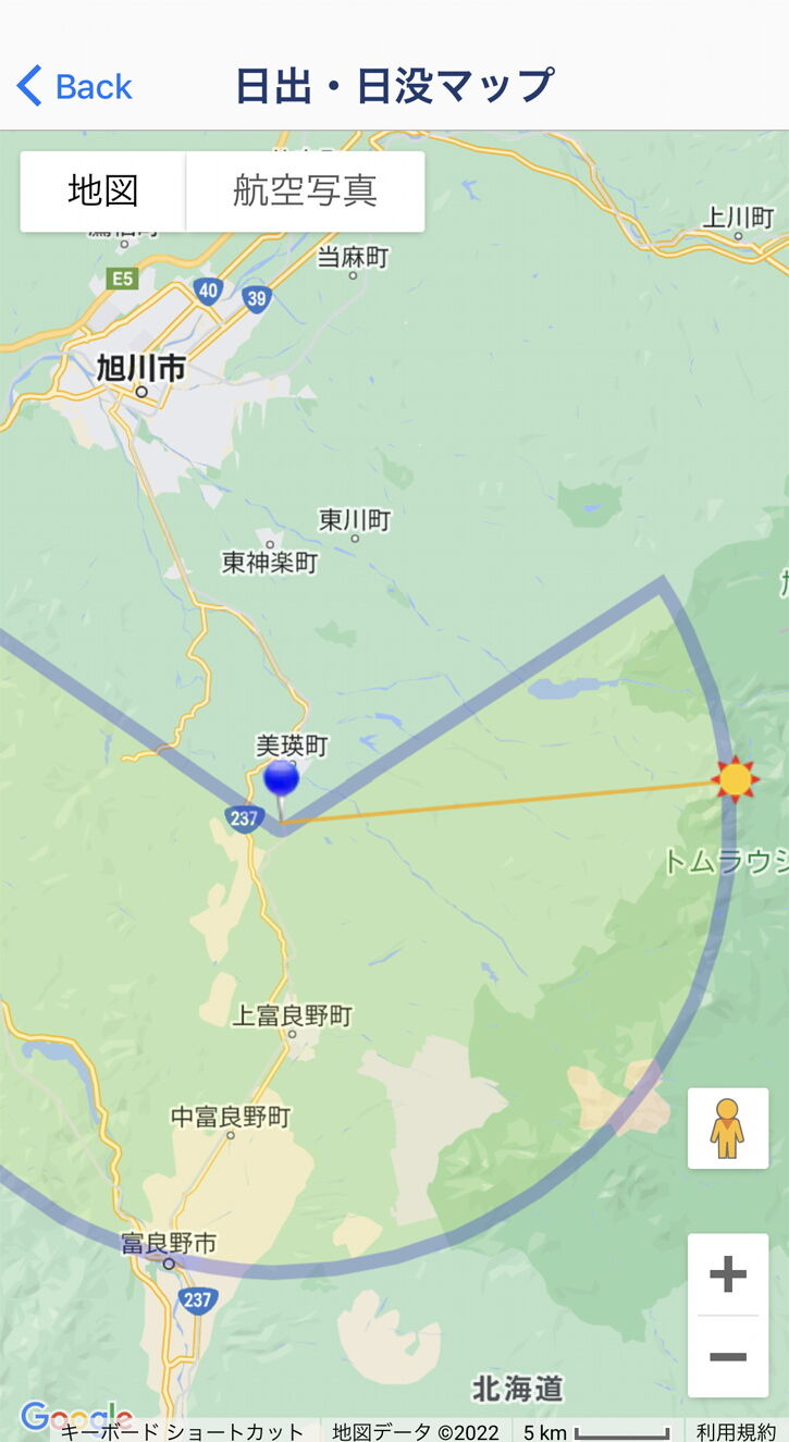 現在、「美瑛の丘をめぐる旅」「北の大地をめぐる旅」「富良野ロケ地をめぐる旅」「富士山ビューポイント」に搭載されている『日出・日没マップ』機能を独立させたもので、設定した場所の日の出、日の入り時刻を計算するアプリです。