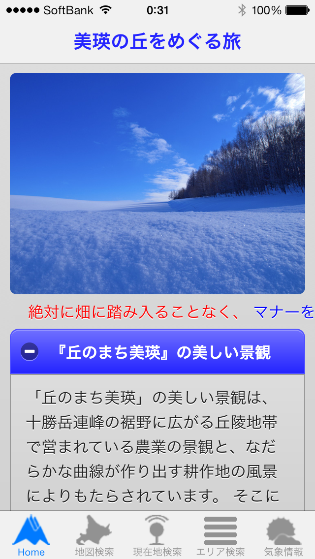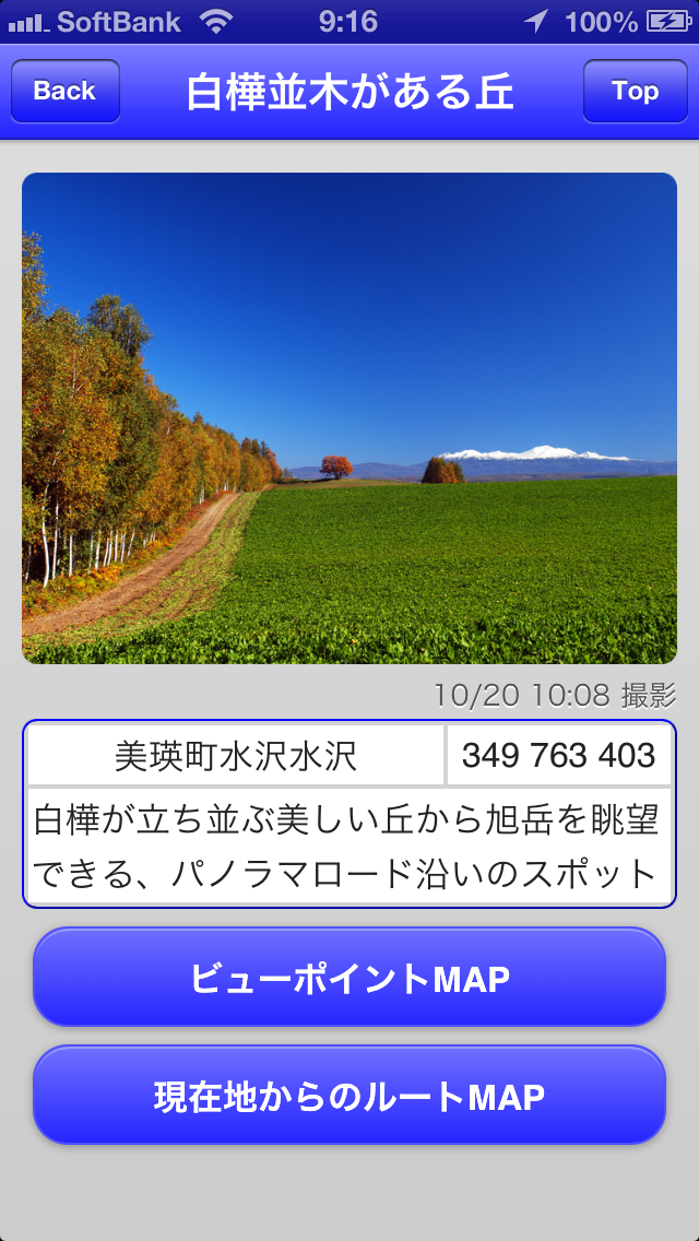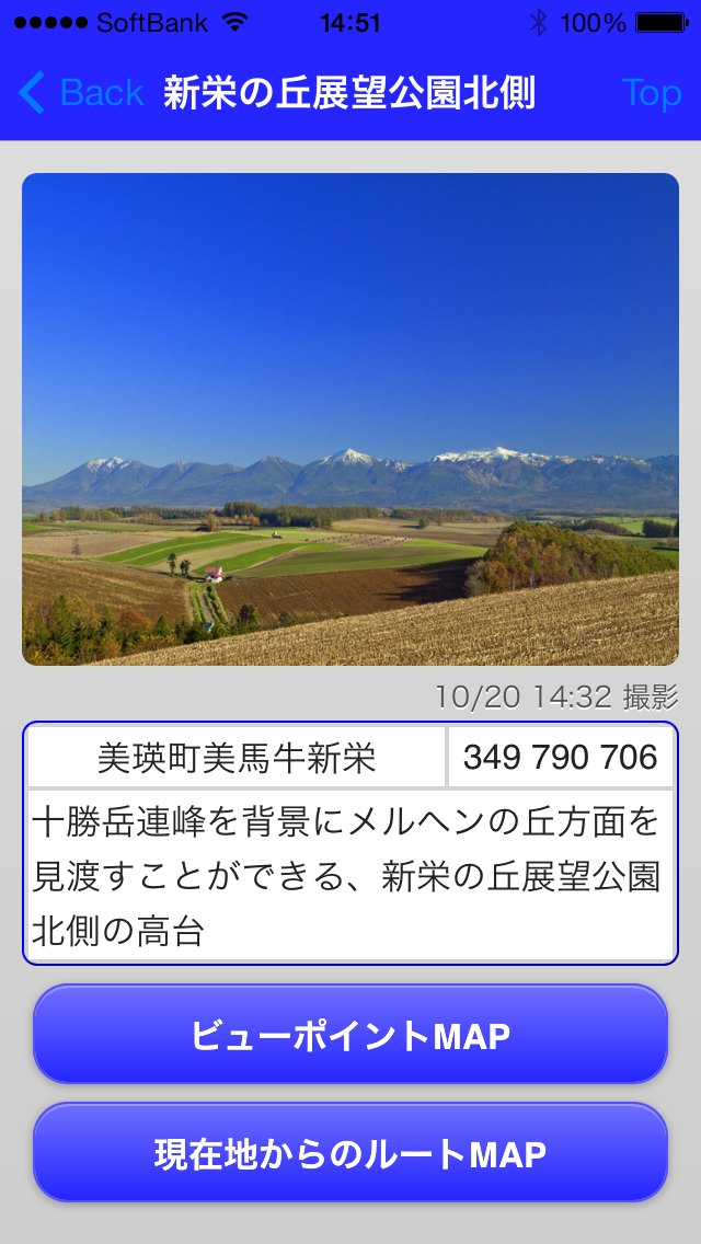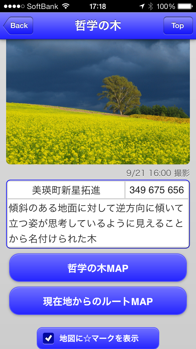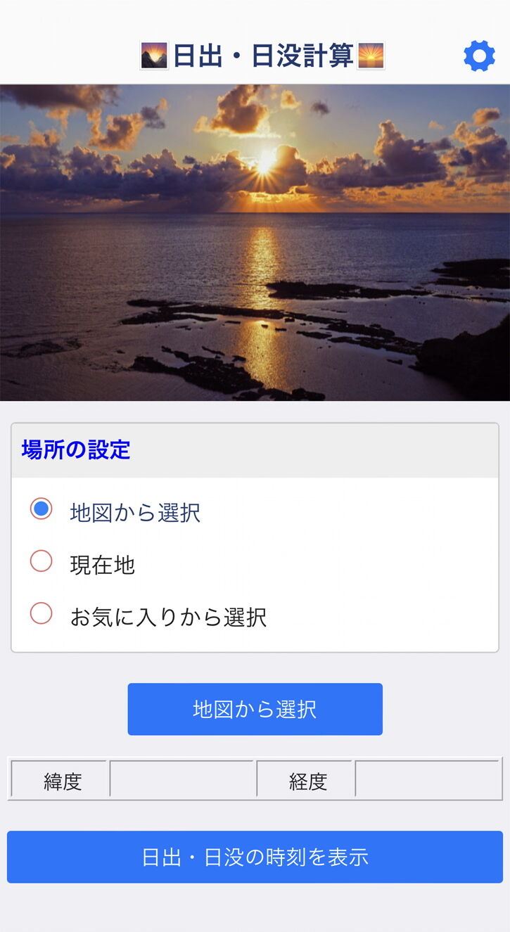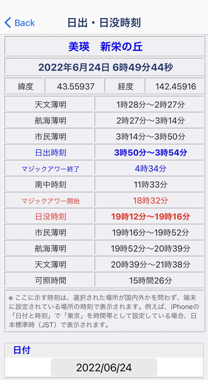 現在、「美瑛の丘をめぐる旅」「北の大地をめぐる旅」「富良野ロケ地をめぐる旅」「富士山ビューポイント」に搭載されている『日出・日没マップ』機能を独立させたもので、設定した場所の日の出、日の入り時刻を計算するアプリです。