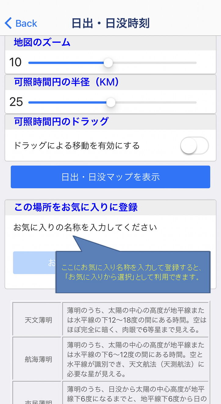 「地図から選択」「現在地」から「日出・日没時刻」画面を表示し、画面を下にスクロールしていくと、以下のように「この場所をお気に入りに登録」というエリアがでてきます。