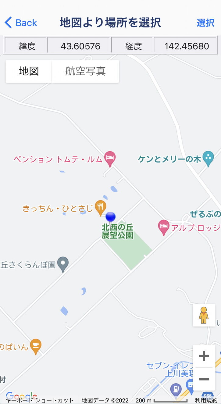 「地図から選択」を選択し、「地図から選択」ボタンをクリックすると、Googleマップが開きますので、地図上から設定したい場所を選択します。下の画面の例では、「北西の丘展望公園」にセットした状態で、地図上に青のピンが示されて、画面上の緯度・経度に設定された位置情報が表示されます。